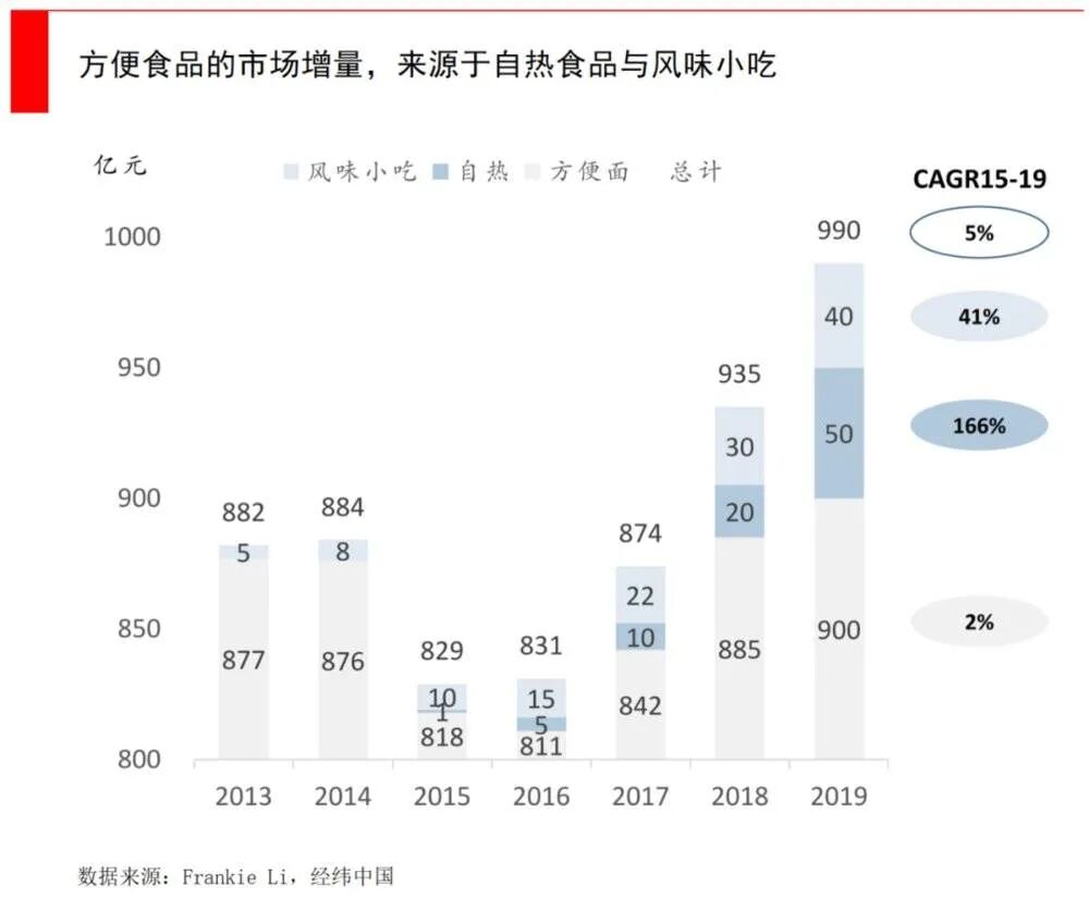 还有一个不得不面对的现实在于,鉴于方便食品瞄准的人群,场景基本趋同,一个品类的增长必将一定程度上吞掉其他品类的市场空间。