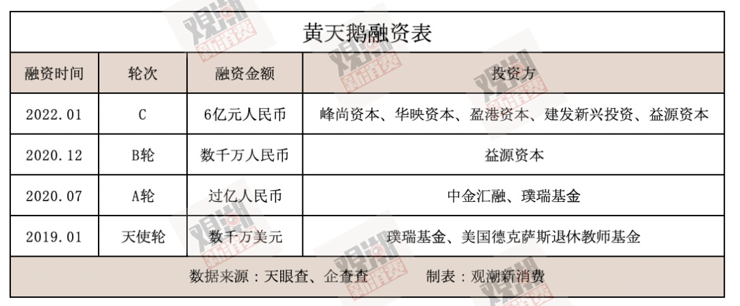 消费者喜爱,黄天鹅也得到了投资人的青睐。观潮新消费(ID:TideSight)据公开数据不完全统计,从2019年获得第一笔投资至今,黄天鹅3年融资额近10亿元。