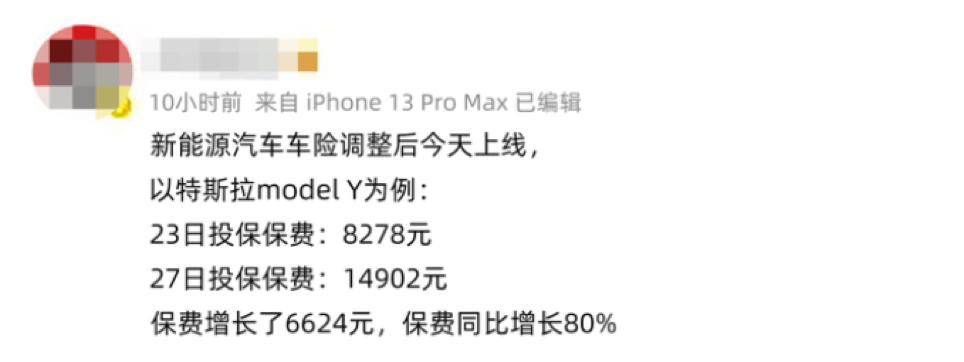 不久后,有车主在社交平台晒出了保单信息,特斯拉Model Y在23日投保时,费用为8278元,而在27日之后,投保费用上涨至1.4万元,涨幅达到80%。