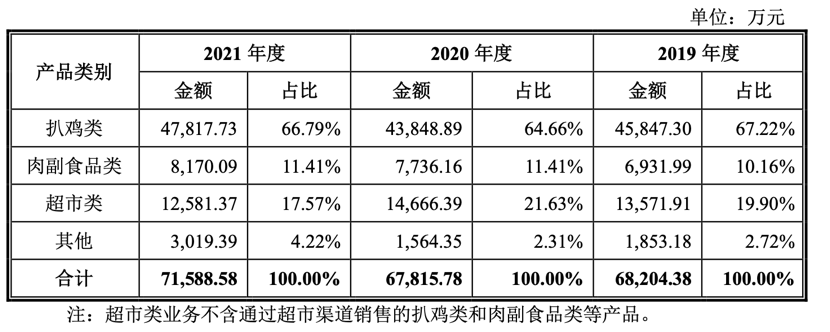 德州扒鸡的收入主要来自扒鸡类产品。具体来看,2019年—2021年来自扒鸡类产品的收入分别为4.58亿元、4.38亿元和4.78亿元,占主营业务收入的比例分别为67.22%、64.66%和66.79%。