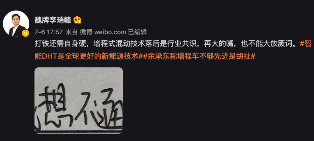 7月6日,华为常务董事、终端BG CEO、智能汽车解决方案BU CEO余承东在微博上吹捧增程式路线的发展前景,随后,魏牌CEO李瑞峰在个人社交账号发文称:“打铁还需自身硬,增程式混动技术落后是行业共识,再大的嘴,也不能大放厥词。”并在博文最后加了一个话题词:“余承东称增程车不够先进是胡扯”。