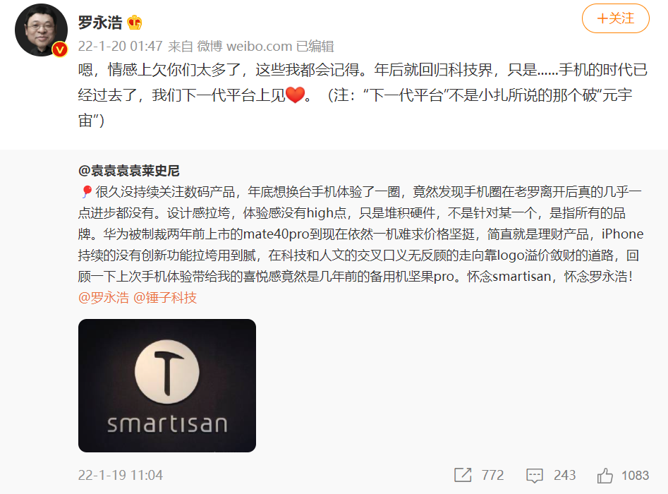 1月20日,罗永浩开始为下一次创业做铺垫,他在微博上宣布,春节之后将回归科技界。“情感上欠你们太多了……年后就回归科技界。只是……手机的时代已经过去了,我们下一代平台上见。”