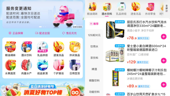 7月28日,观潮新消费(ID:TideSight)注意到,每日优鲜APP首页出现服务变更通知,由原本支持30分达改为支持次日达,配送范围为全国均可配送。