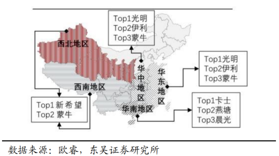 与常温奶赛道不同,低温奶市场更加分散,由于这些区域性企业发展已久,当地消费者对它们的认知度和归属感更强,这便造成了低温奶赛道“诸侯割据”的局面。