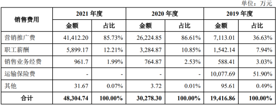 此外,营销的高举高打也体现在招股书上,销售费用从2019年的1.94亿元增长到2021年的4.83亿元,其中营销费用更是连续两年占比超85%。