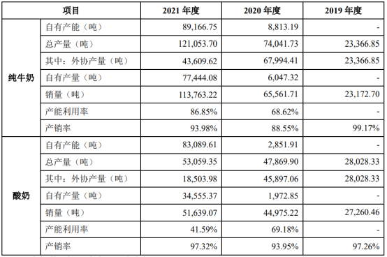 更何况,认养一头牛并非所有的牛奶都来自于自有牧场,部分产品实为代工。2019年公司的纯牛奶和酸奶的加工生产来自外协厂商,2020年仍有超过九成来自外协厂商,这也更加戳破了“认养”的概念。