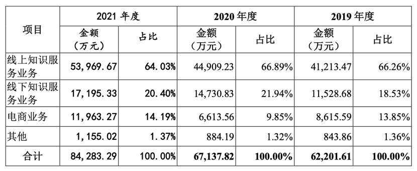 据招股书显示,2019年-2021年公司线上知识服务的营收占主营业务营收的比例分别为66.26%、66.89%及64.03%。也就是说,卖课依然是目前思维造物的营收主力。