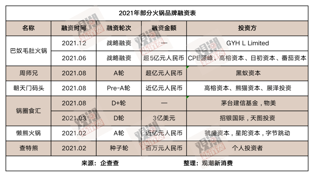 观潮新消费(ID:TideSight)据公开数据不完全整理,2021年,超30亿元资本涌入火锅行业。火锅行业上下游企业接连融资,背后不乏IDG资本、字节跳动、高榕资本、黑蚁资本等一线投资机构。