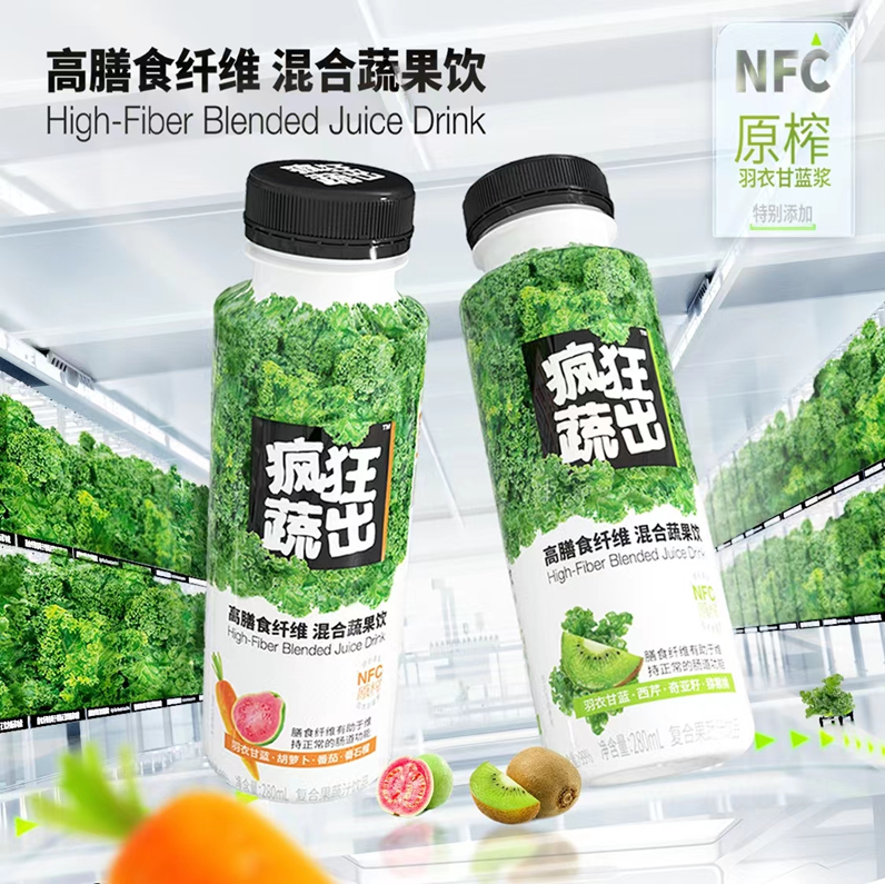 日前,元气森林推出新品:「疯狂蔬出」高膳食纤维混合蔬果饮,0脂肪、0山梨酸钾、0苯甲酸钠。
