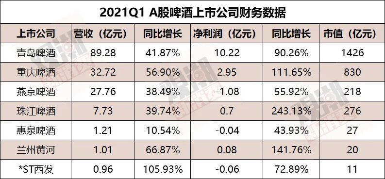 同样的紧迫感也出现在青岛啤酒、重庆啤酒、华润啤酒等诸多啤酒龙头企业身上。签约顶流、IP联名、借助热门综艺等营销方式层出不穷,效果仿佛立竿见影——2021年Q1财报显示,国产啤酒7家上市公司的营收、净利润全部实现两位数以上的双增长。