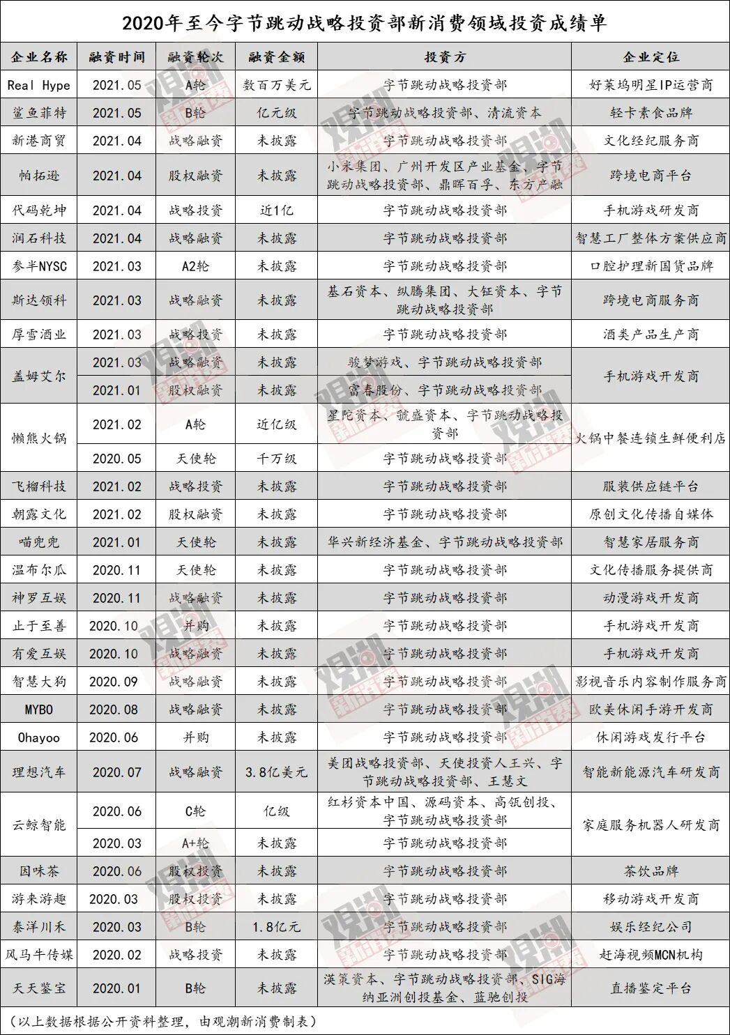 观潮新消费(ID:TideSight)根据公开数据不完全统计,从2020年至今,字节跳动在新消费领域共投28家,大部分为战略投资且偏爱独投,其中对盖姆艾尔、懒熊火锅、云鲸智能都是连投。