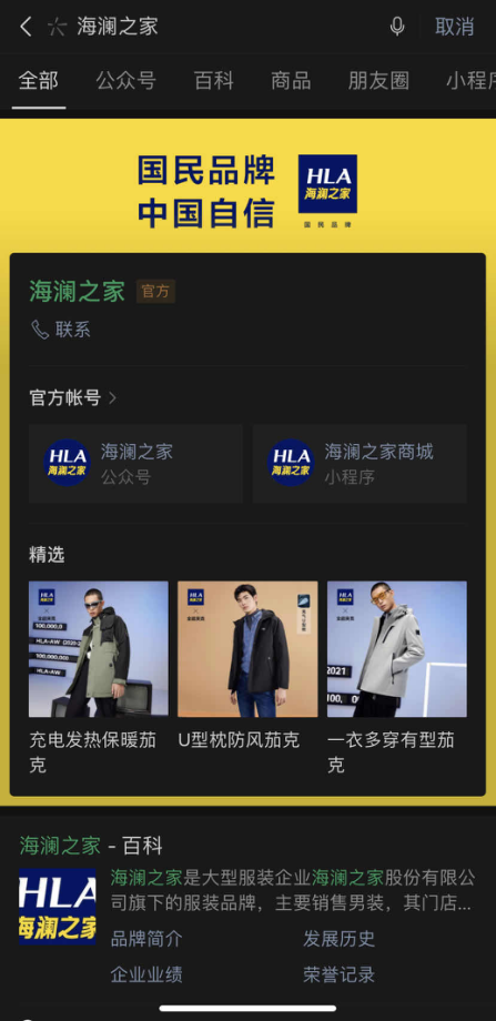 现在在微信搜索“海澜之家”,依然可以看到其完整的微信生态搭建。