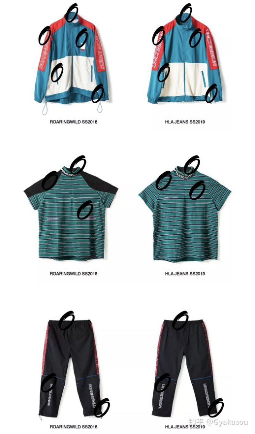 比如被黑鲸HLA JEANS“重度借鉴”过的品牌就有巴黎世家、supreme、adidas yeezy、fr2,就连中华区的roaringwild、soulgoods和李宁都未能幸免。