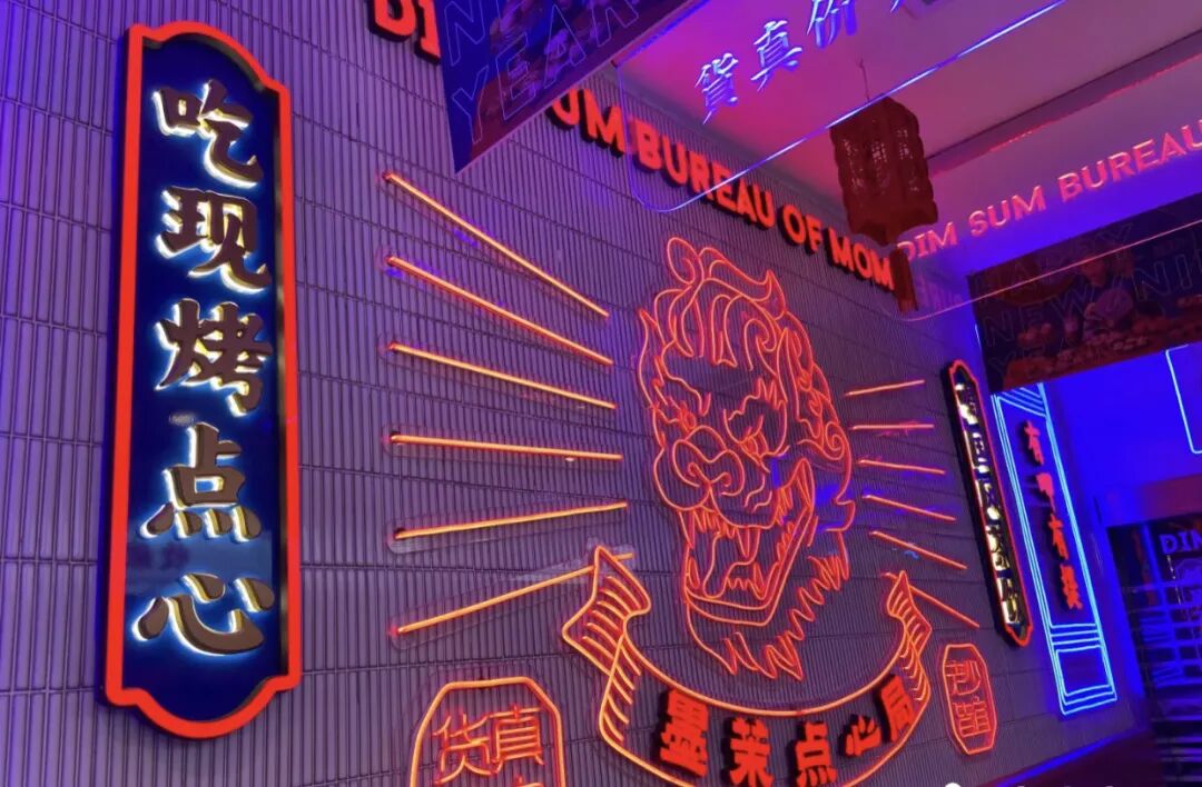 主logo也是品牌IP采用的是中国传统瑞兽“狮子”的图案,简约的笔触配合生动的表情,赋予品牌摩登复古的设计辨识度;高饱和度红蓝搭配的主色调古朴大气,佐以霓虹灯牌+实木铺陈的混搭装饰,让墨茉门店坐实了“国潮烘焙”的风格定位。