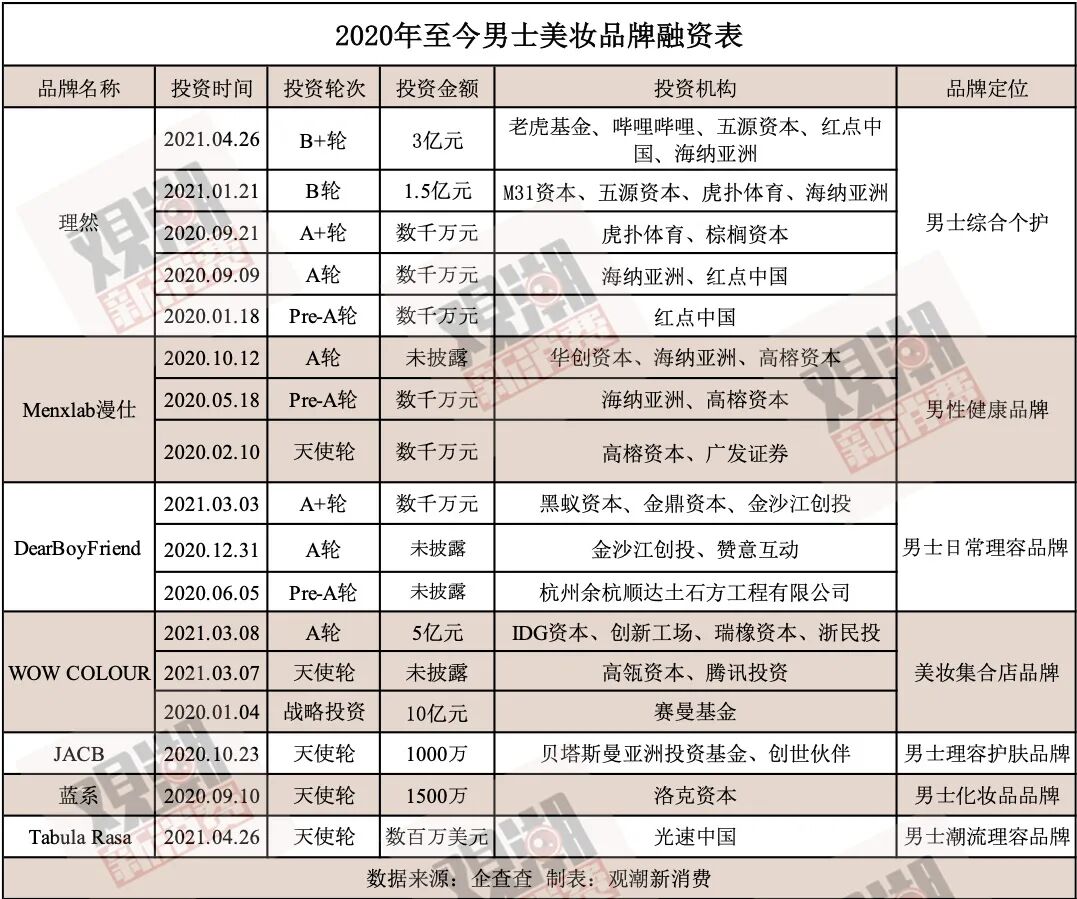 步入2021年,越来越多专注男性经济的消费品牌受到资本市场的青睐。观潮新消费(ID:TideSight)注意到,仅以男士理容市场为例,年初至今,投融资案例超过10例,数额都在数千万级别,甚至不乏亿元级别的融资出现。