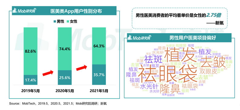 据《2021“男颜经济”研究报告》数据,2019.5-2021.5医美类APP男性用户逐年上升,从17.4%到25.6%再到35.7%,随着男性对自己的外貌越来越重视,医美市场成为了男颜经济的稳定掘金点之一。