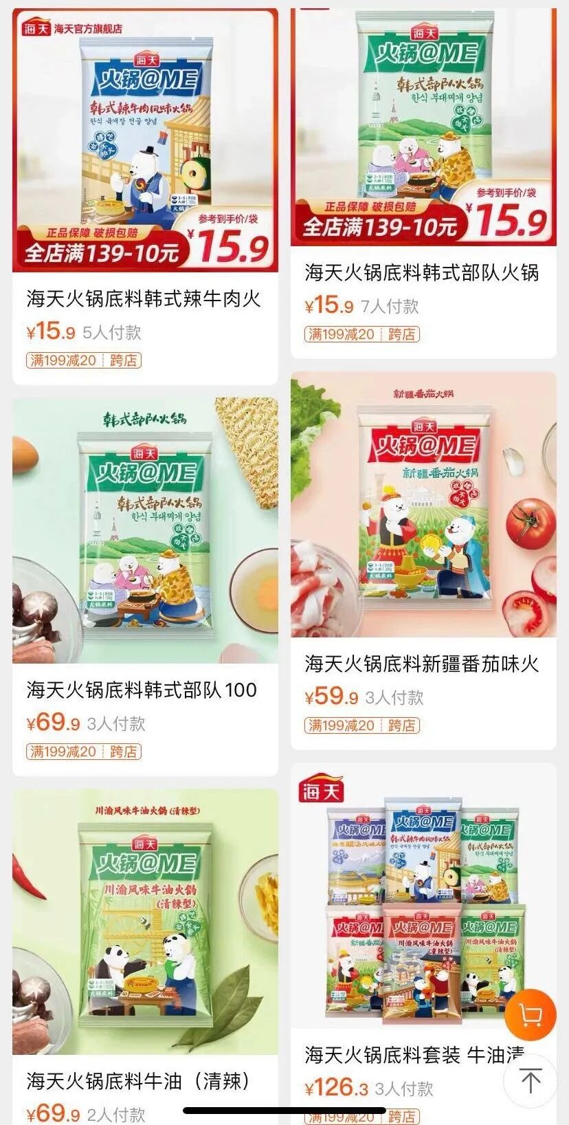 从海天线上旗舰店数据来看,其多数调味品的销量只有酱油、蚝油等核心产品的十分之一甚至百分之一,火锅底料新品的购买量更是只有个位数。