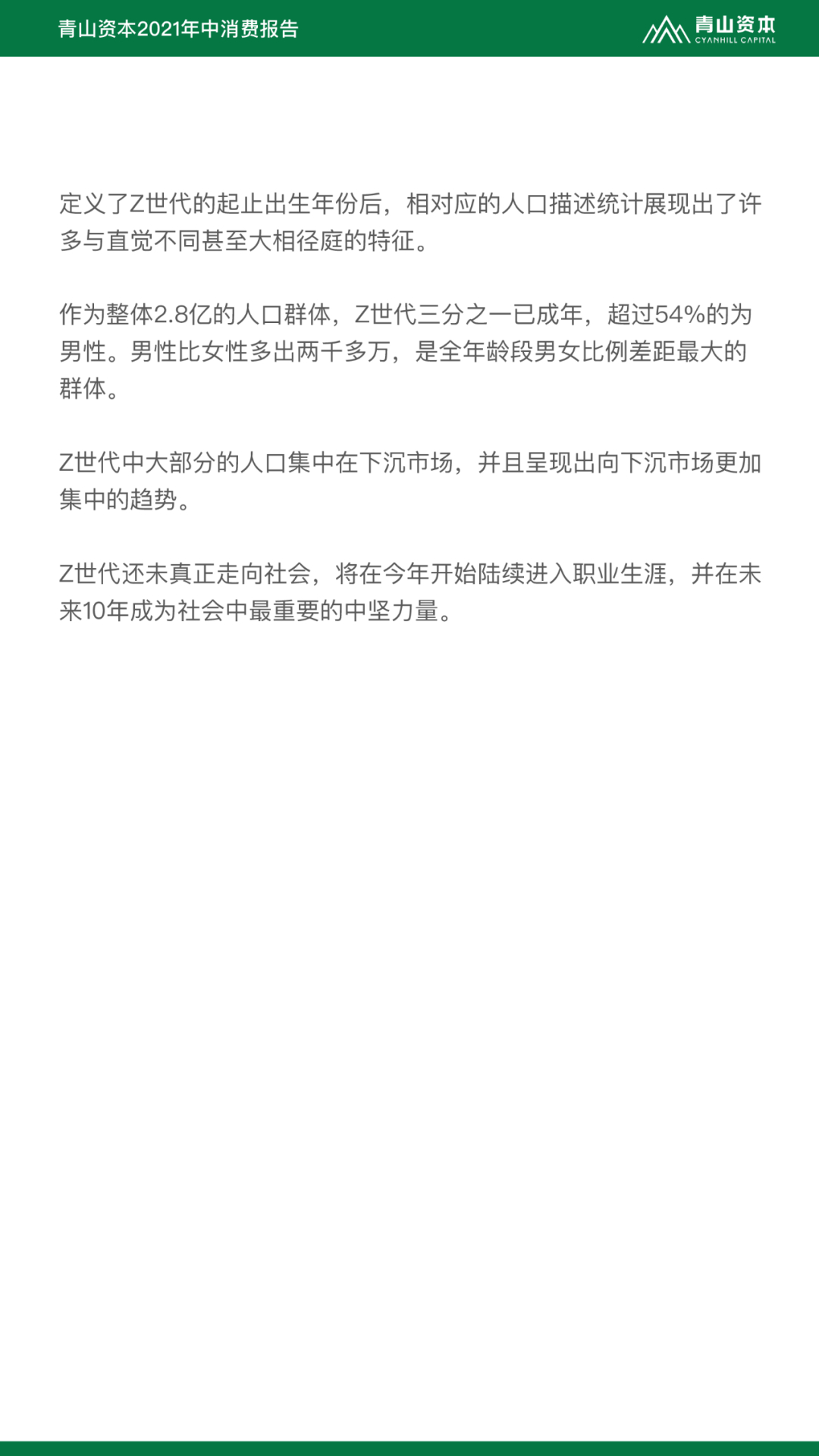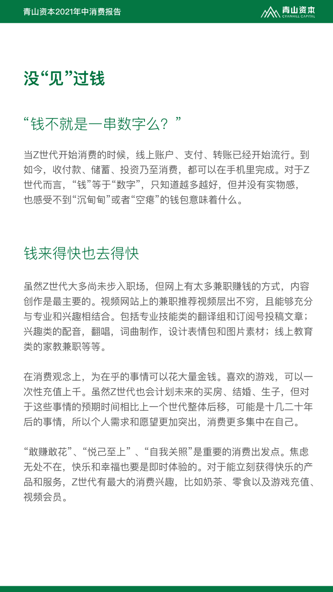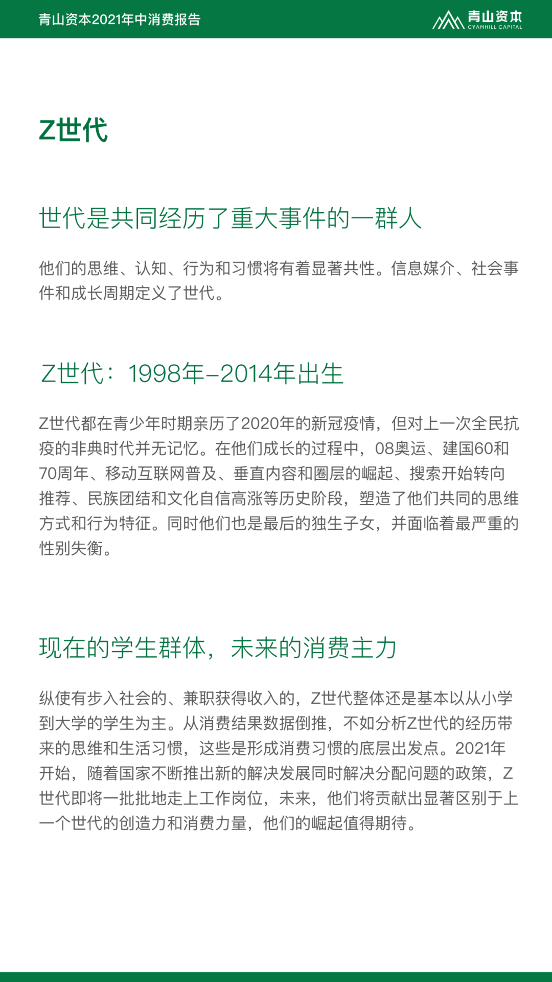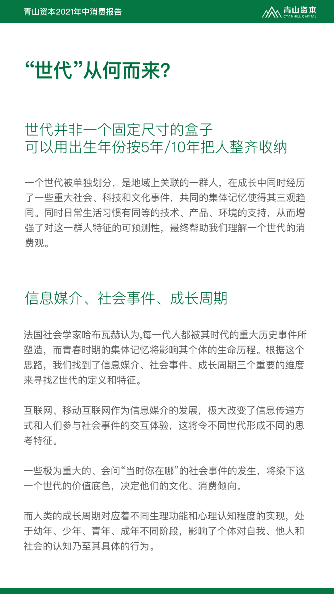一代人为什么会有这样那样的行为特征,它的来源是什么,是什么导致了他们可能会说“我在线上逛街,或者我喜欢一个人生活,或者我并不在乎钱”,青山资本这个报告尝试去探索因而不仅是果。