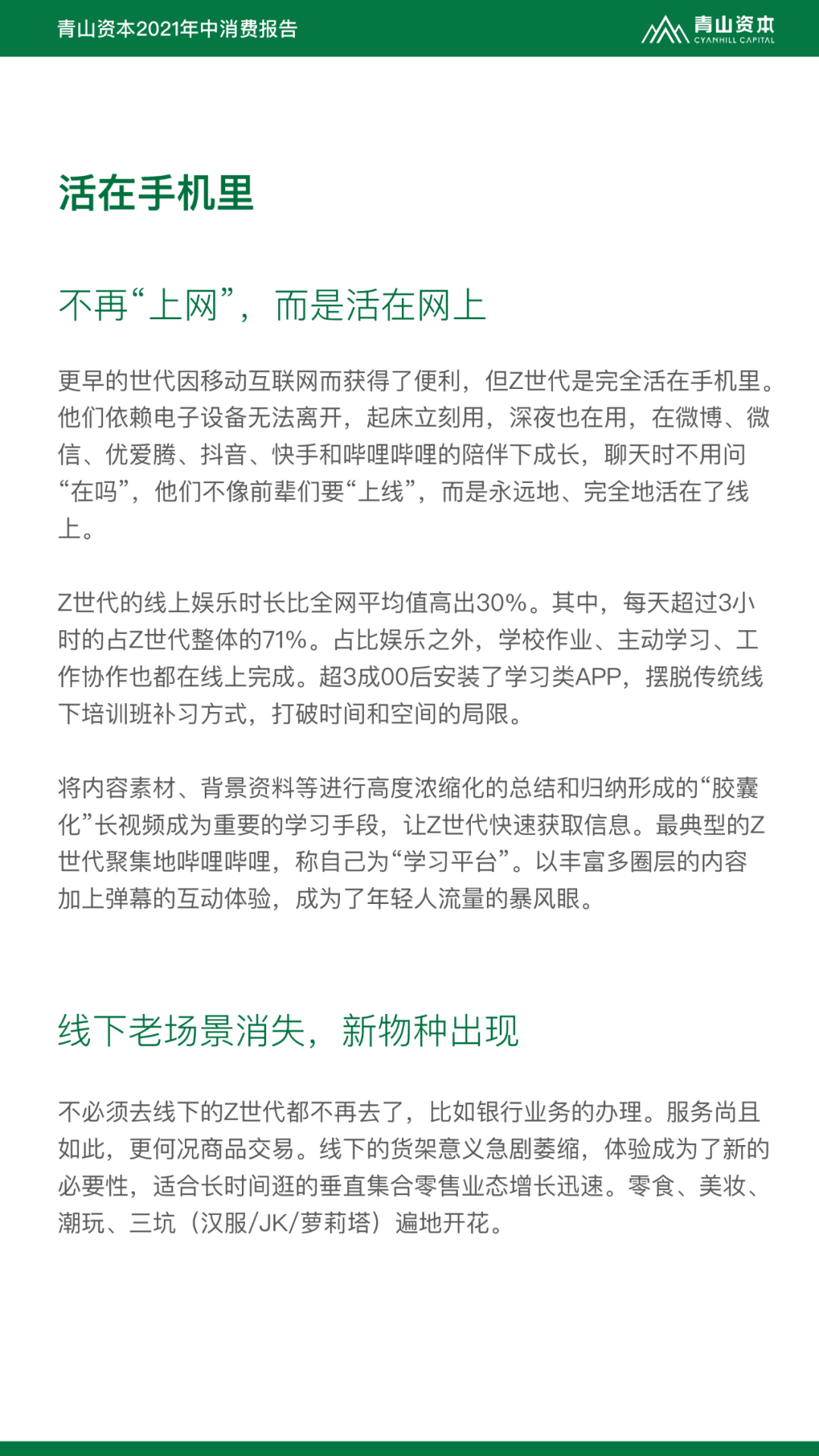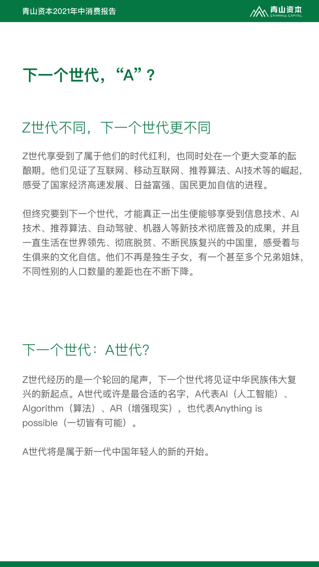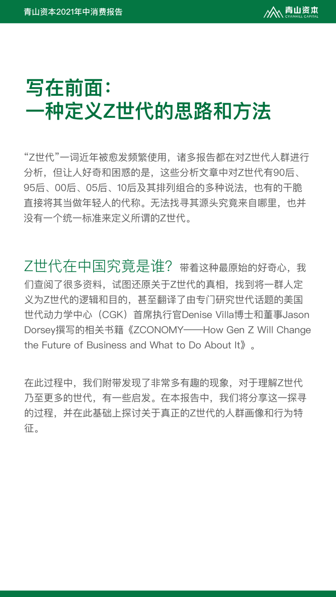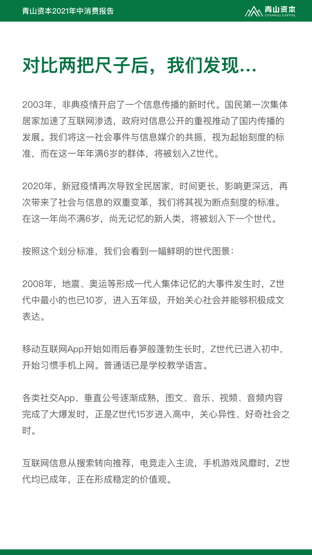 一代人为什么会有这样那样的行为特征,它的来源是什么,是什么导致了他们可能会说“我在线上逛街,或者我喜欢一个人生活,或者我并不在乎钱”,青山资本这个报告尝试去探索因而不仅是果。