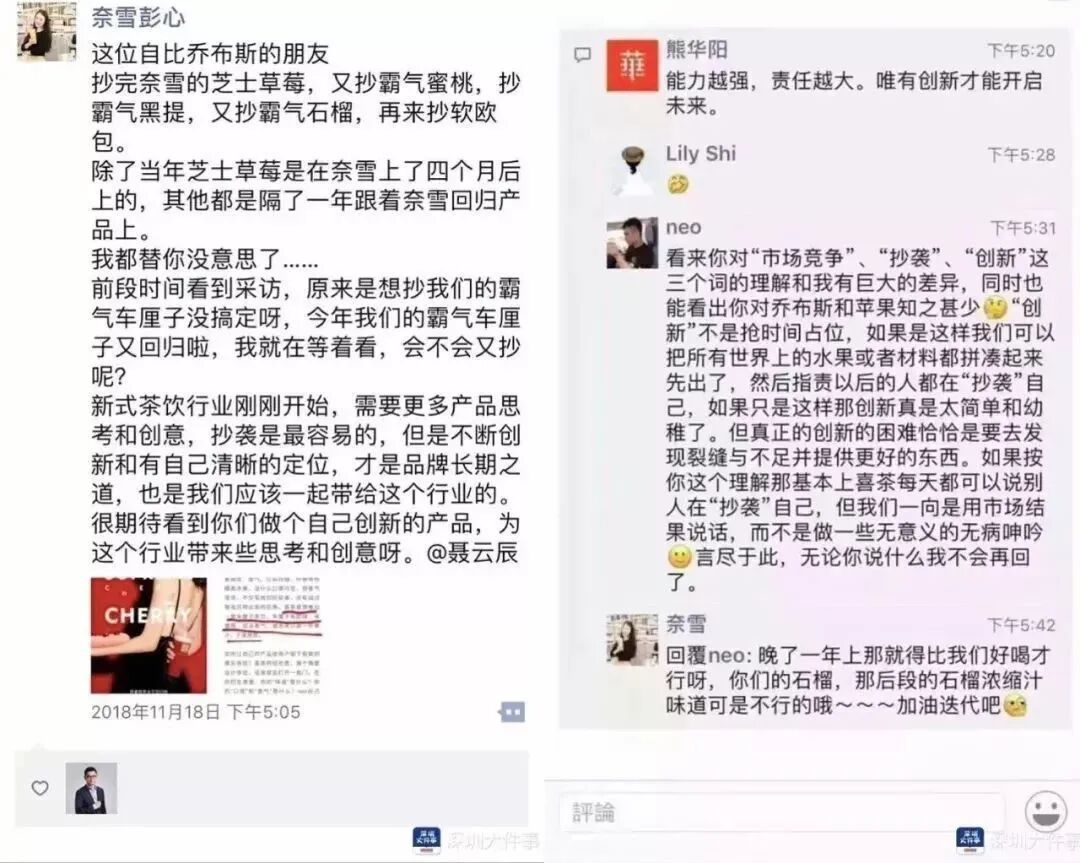 2018年11月,奈雪的茶创始人在朋友圈公开点名喜茶抄袭:“新式茶饮业刚刚开始,需要更多的产品思考与产品创意,抄袭是最容易的,但是不断创新和有自己的清晰的定位才是品牌企业的长久之道。”