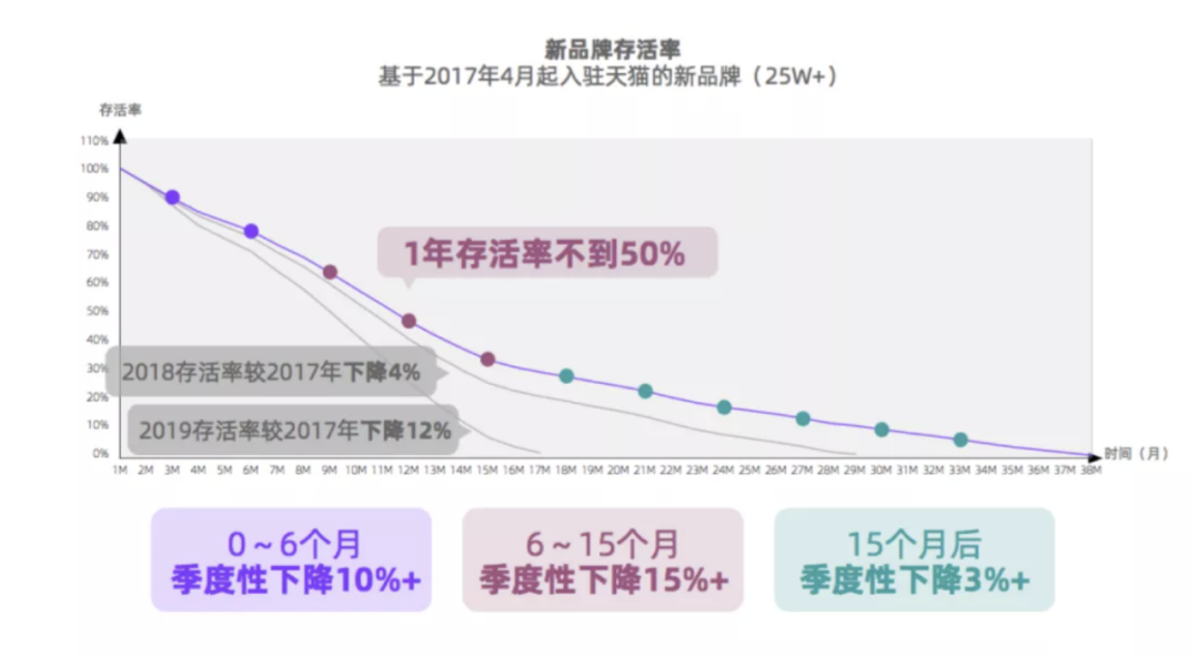 数据显示,2017年入驻天猫的新品牌的“一年存活率”不足50%,而去年入驻品牌的一年存活率只剩下30%。