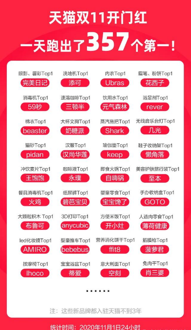 比起双十一当天的销售额,反而是今年第一波售卖期的新品榜单更有看头。根据天猫11月1日公布的数据,当日已有357个新品牌成为行业TOP 1。
