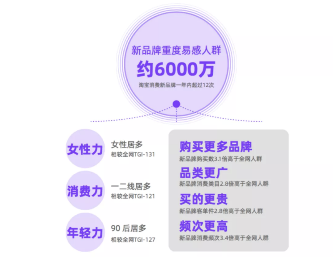 通过数据分析,平台会把一年内淘宝消费新品牌超过12次的人群定义为“新品牌重度易感人群”。他们的典型画像是女性、居住在一二线、90后,覆盖多个年轻圈层并拥有鲜明的消费特征。