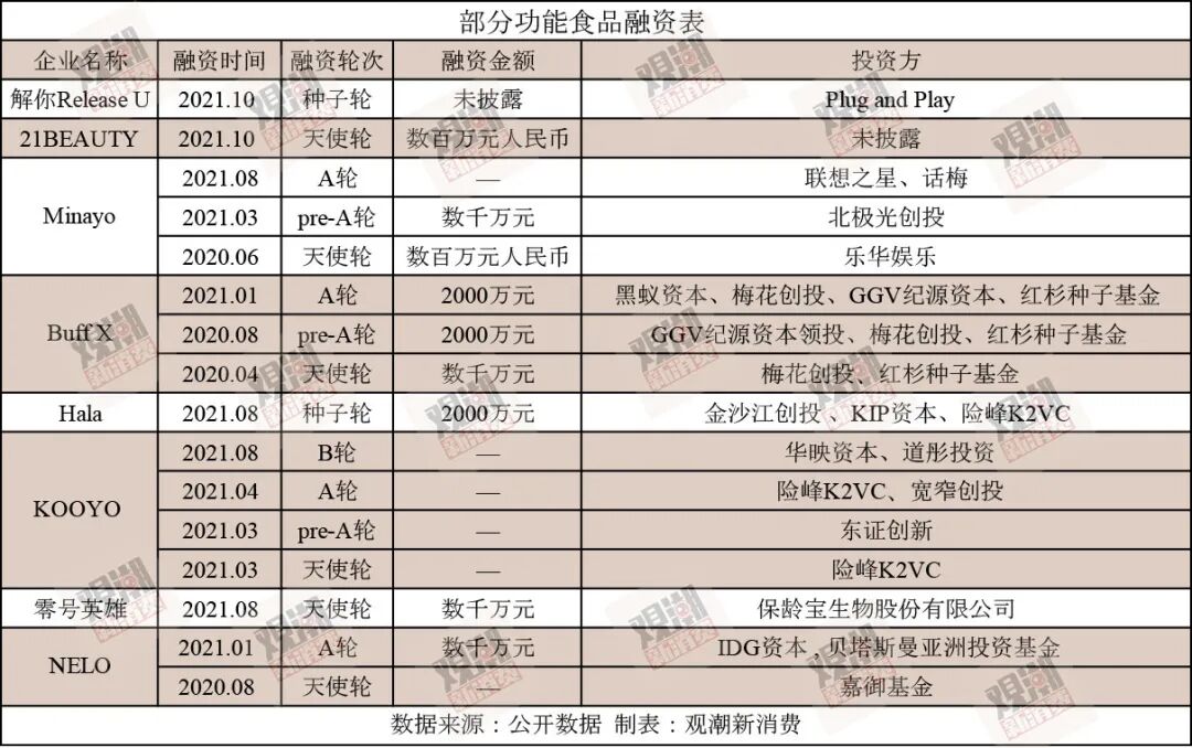 观潮新消费(ID:TideSight)据公开信息不完全统计,仅2021年,功能食品融资事件12件起,融资总金额过亿元。