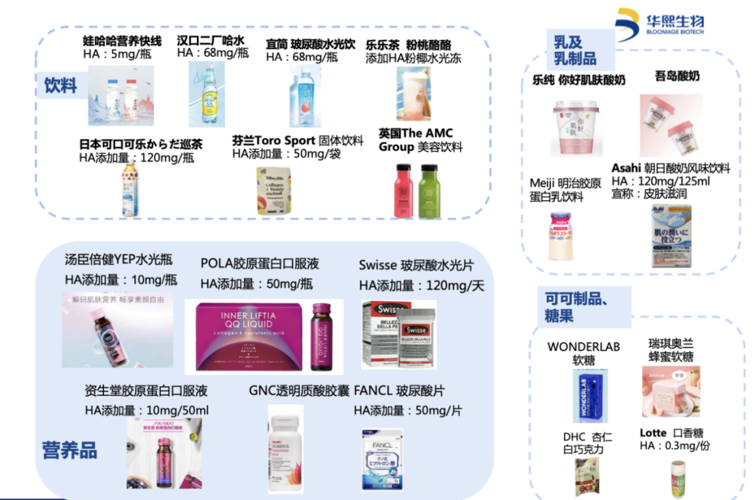 华熙生物率先推出国内首个玻尿酸食品品牌“黑零”,上线了透明质酸咀嚼片、软糖、水光饮、燕窝饮等产品。此外,汉口二厂将玻尿酸注入到气泡水中,Wonderlab推出口服透明质酸软糖,新品牌屋里可可也将玻尿酸与可可相结合,推出“玻尿酸可可”。