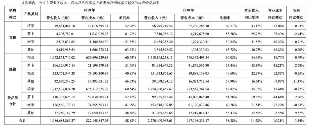 但萝卜作为公司另一大单品,在2018年、2019年终于收入破亿后举步维艰,2020年跌破亿元。