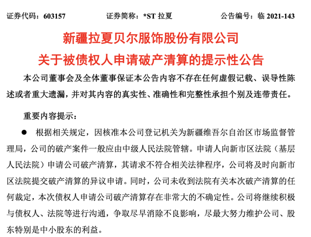 同时,拉夏贝尔表示未收到法院有关本次破产清算的任何裁定,本次债权人申请公司破产清算存在非常大的不确定性。