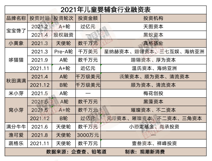 观潮新消费根据公开数据不完全统计,仅2021年婴童食品领域发生投融资事件近20起,融资金额超15亿元,超20家VC入局。