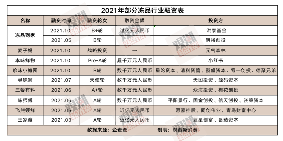 观潮新消费(ID:TideSight)据公开数据不完全统计,仅2021年,我国冻品行业融资事件10余起,融资金额共计数亿元。其中冻品供应链企业3家,速冻食品及预制菜品牌6家。