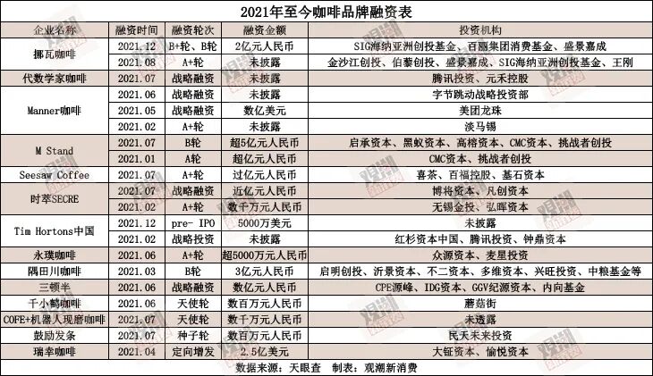 还可以明显看到,2020年,资本对咖啡市场的关注度主要集中在线上品牌,2021年则是集中在线下连锁精品咖啡。