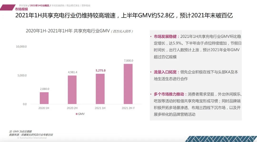 欧睿国际发布的《2021上半年共享充电行业报告》显示,2021年上半年,行业GMV(总交易额)约52.8亿元,预计2021全年GMV超过百亿规模。