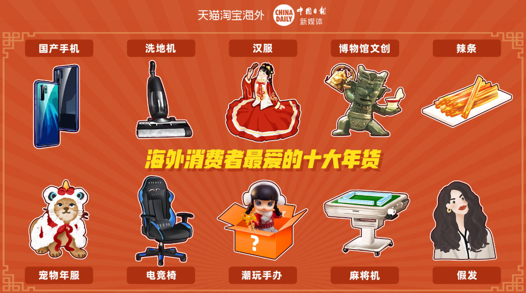 1月20日,淘宝联合中国日报新媒体发布“海外消费者最爱的十大年货”,洗地机、辣条、麻将机、电竞椅、汉服等国货入选。国风、国潮是海外消费者最爱年货的关键词。