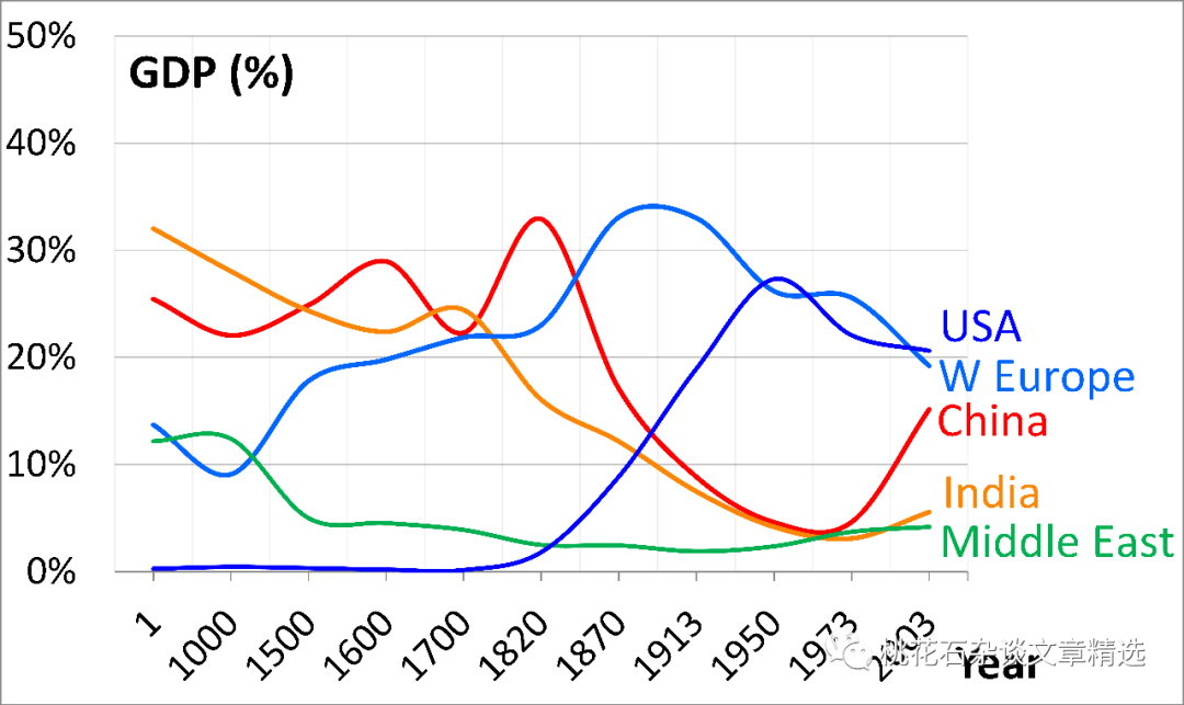 相对严谨的2000年来各国GDP在全球占比的图表,其中的红色代表中国