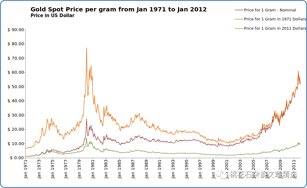 1968年来黄金价格的变化,可以看到黄金的价格也是波动极其剧烈的