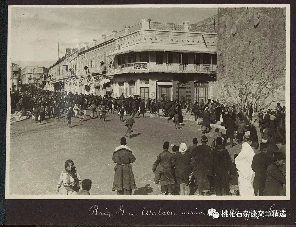 1917年,英国军队进入耶路撒冷。耶路撒冷是几个同源宗教犹太教、基督教和伊斯兰教的圣城,因为在历史上也曾经成为中东地区各方势力争夺的焦点。公元11世纪末到13世纪末,西方人为了从阿拉伯人和突厥人手里夺取耶路撒冷发动了至少9次十字军东征,但自公元1244年十字军被花剌子模军队逐出耶路撒冷之后,西方在长达600多年的时间里始终没能再次占领耶路撒冷。而在第一次世界大战中,占领耶路撒冷的奥斯曼帝国陷入崩溃,最终使英国军队在1917年12月9日进入耶路撒冷,使这座城市在时隔600多年后再次被西方占领,这张照片拍摄于英军入城当天。