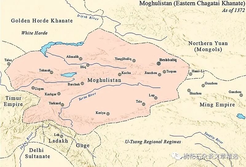 而察合台汗国在公元1340年分裂成了东西两个汗国,其中的西察合台汗国在公元14世纪晚期被身份非常可疑的帖木儿控制,其大汗都成为帖木儿家族的傀儡。而帖木儿本身的蒙古后裔身份都成疑,就算他是蒙古人,他的父系也肯定没有铁木真的血统,所以他本人以及由他的六世孙巴布尔建立的印度莫卧儿王朝肯定不能算是铁木真后裔建立的王朝了。而东察合台汗国后来演变成了吐鲁番汗国,最后又被从其境内分裂出的叶尔羌汗国灭亡。而叶尔羌汗国也是出自东察合台汗国的贵族阶层,因此其血缘也可以追溯到铁木真。但叶尔羌汗国在公元1680年被准噶尔部灭亡,至此察合台汗国的余脉宣告终结。