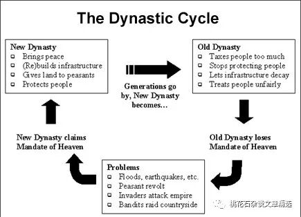 (西方人眼中的中国历史循环:旧朝腐败堕落,政府不作为->失去“天命”->自然灾害、饥荒或外敌入侵等导致旧朝无法维系->新朝重建和平->新朝宣称继承“天命”->几代之后,新朝变旧朝,重复旧朝命运)