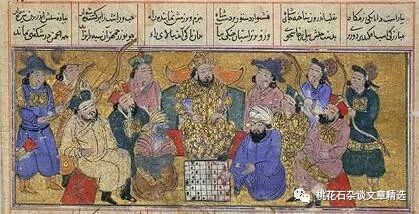 波斯古画里波斯国王和印度使节下波斯象棋的场景