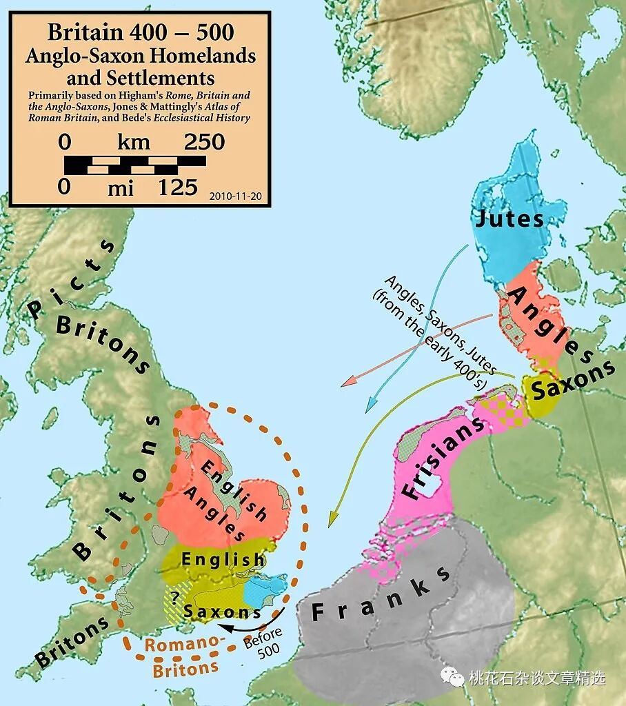 公元5到6世纪撒克逊等日耳曼部落入侵不列颠的形势,撒克逊人对不列颠的侵扰其实在公元280年就已开始