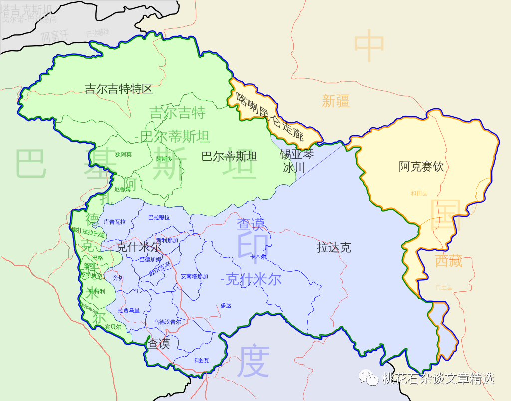 (西方人定义的克什米尔地区,图中可以看到今天被印度吞并的拉达克地区,而右边黄色区域则是中国新疆和田和西藏阿里部分地区,西方人称之为阿克塞钦,意思是“中国的白石滩”)