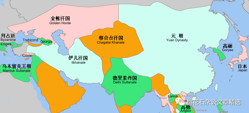 所以许多人经常提到的元朝和四大汗国也就在这时算是真正存在过一段时间,而这里的四大汗国是指金帐汗国、伊儿汗国、察合台汗国和窝阔台汗国。当时的情况也就是下面图片里所展示的: