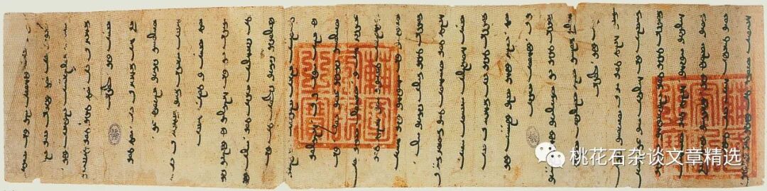 (公元1305年伊儿汗完者都致法王腓力四世的信任,上面加盖了元朝皇帝所赐汉文印章“真命皇帝和顺万夷之宝”)