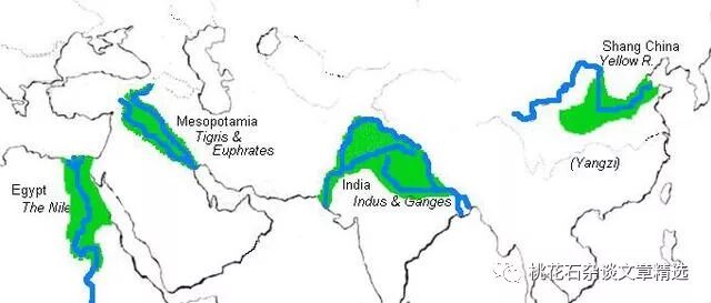 1、亚非交界处的新月沃土地区,其中包括两河流域(美索不达米亚)和古埃及;