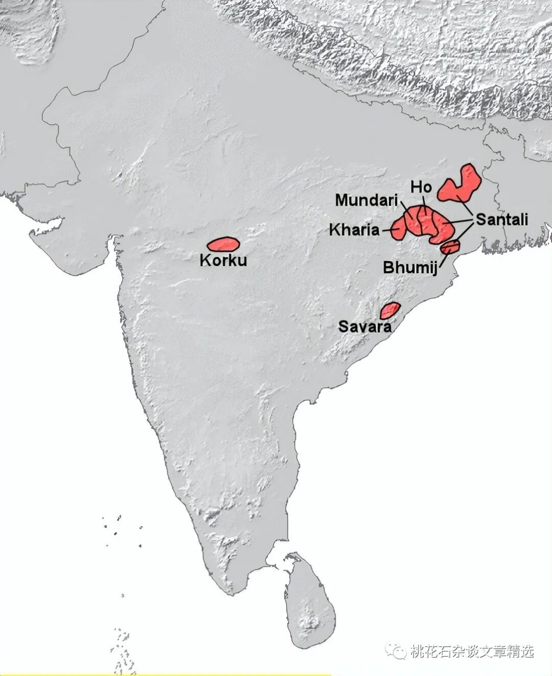 那么说到这,我们也就必须要简单介绍一下南亚语系究竟包括哪些语言了。其实南亚语系在中文里有时又被称为澳亚语系,但在桃花石杂谈看来这两个中文名称都有一定误导性。首先虽然在英语等欧洲语言里,南亚语系是指“南部亚洲”的语言(Austroasiatic languages),但它用来指代南方的词是Austro,而这个词是源自拉丁语,和很多现代欧洲语言用来指代南方的词south或者sud等不一样,所以在欧洲语言里不会被人认为是指印度、巴基斯坦、孟加拉等南亚次大陆地区。