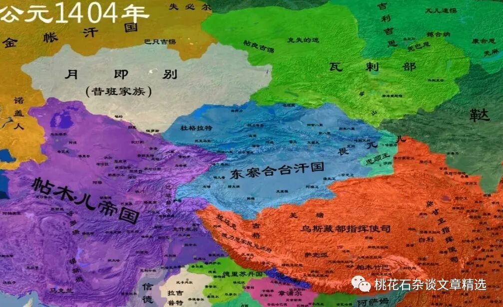 (帖木儿在公元1404年进军东方时,他的领土和明朝之间,除了塔克拉玛干、天山和喜马拉雅山,还隔着东察合台汗国)