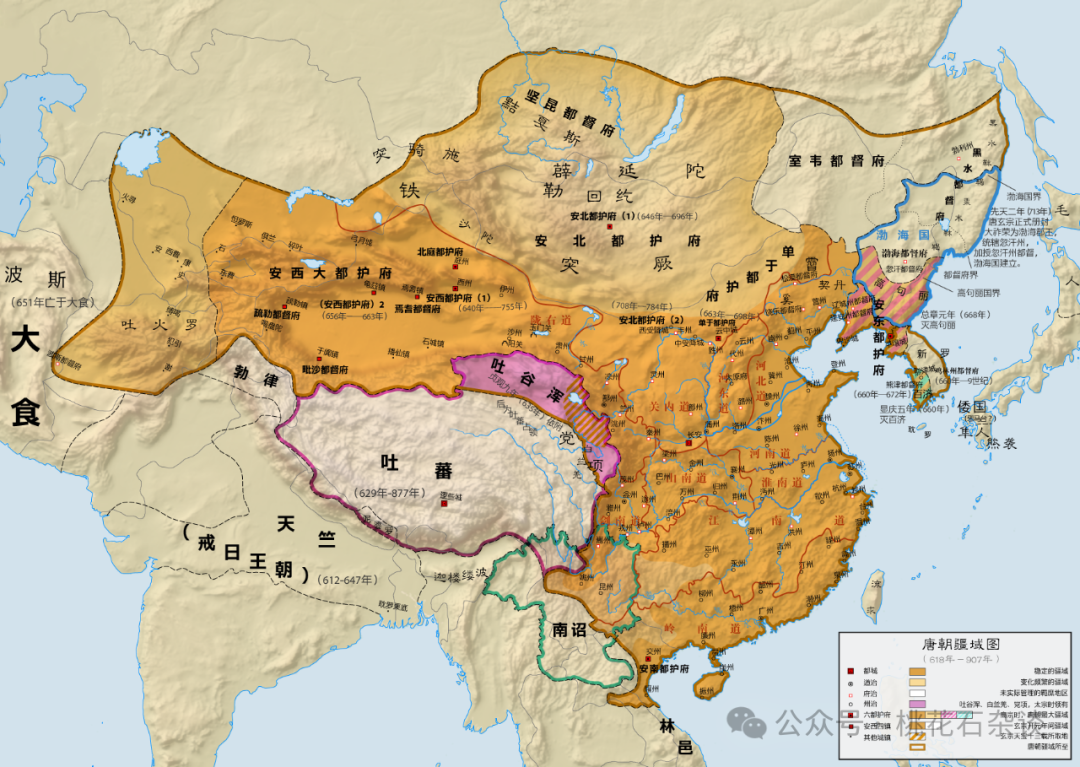 公元8世纪唐朝大致版图,最左侧大食为阿拉伯帝国,当时双方已经接壤
